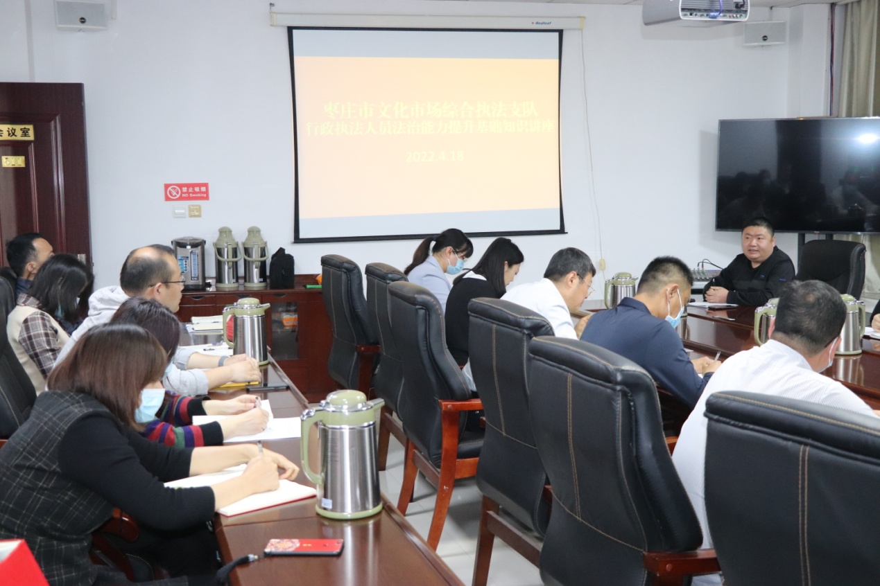 4月18日,枣庄市文化市场综合执法支队举办行政执法人员法治能力提升基础知识培训班,特邀请市局科技和政策法规科杜大伟同志作题为《深入学习贯彻习近平法治思想 带头尊法学法守法用法 推进文旅行业依法治理》的专题讲座。