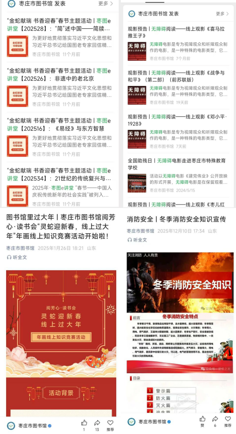 积极拥抱数字时代,在微信公众号常态化推出“枣图e讲堂”、线上观影、主题竞答、线上科普等丰富活动,同时开通“博看Ai书苑”等特色数据库,累计发布推文1300余篇,打破阅读时空界限。